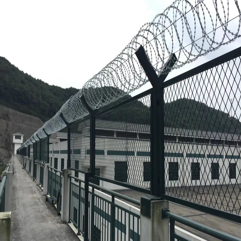 立柱要求:監獄隔離網的立柱需要根據不同的高墻來設計成不同的樣式,一般分為:底盤柱、側面底盤柱、小底盤柱等等。立柱的原材料外形尺寸一般選: 80*80/60*60等等。 大多數采用帶v型柱的立柱,頂部安裝蛇腹形刀刺網。